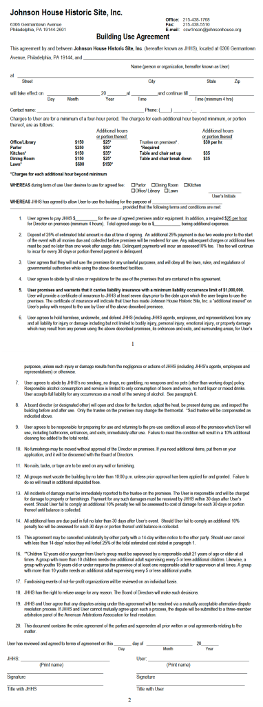 Please note: rental requests are subject to review and approval by Johnson House Historic Site, Inc., and completion of the Use Agreement does not guarantee availability.